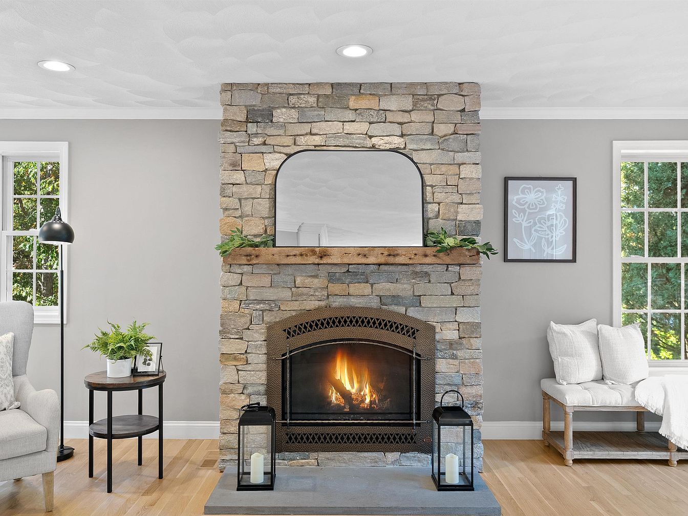 A cozy living room featuring a prominent stone fireplace as the focal point. The textured stone walls blend earthy tones with a rustic wooden mantle above, accentuated by a curved mirror. Light gray walls create a soft backdrop, while warm wooden flooring adds a natural warmth. To the left, a sleek black floor lamp stands beside a modern gray armchair with plush cushions. A round side table holds a potted plant and a framed photo. On the opposite side, a minimalist wooden bench draped with a white blanket complements the serene ambiance, enhanced by large windows flooding the space with natural light.