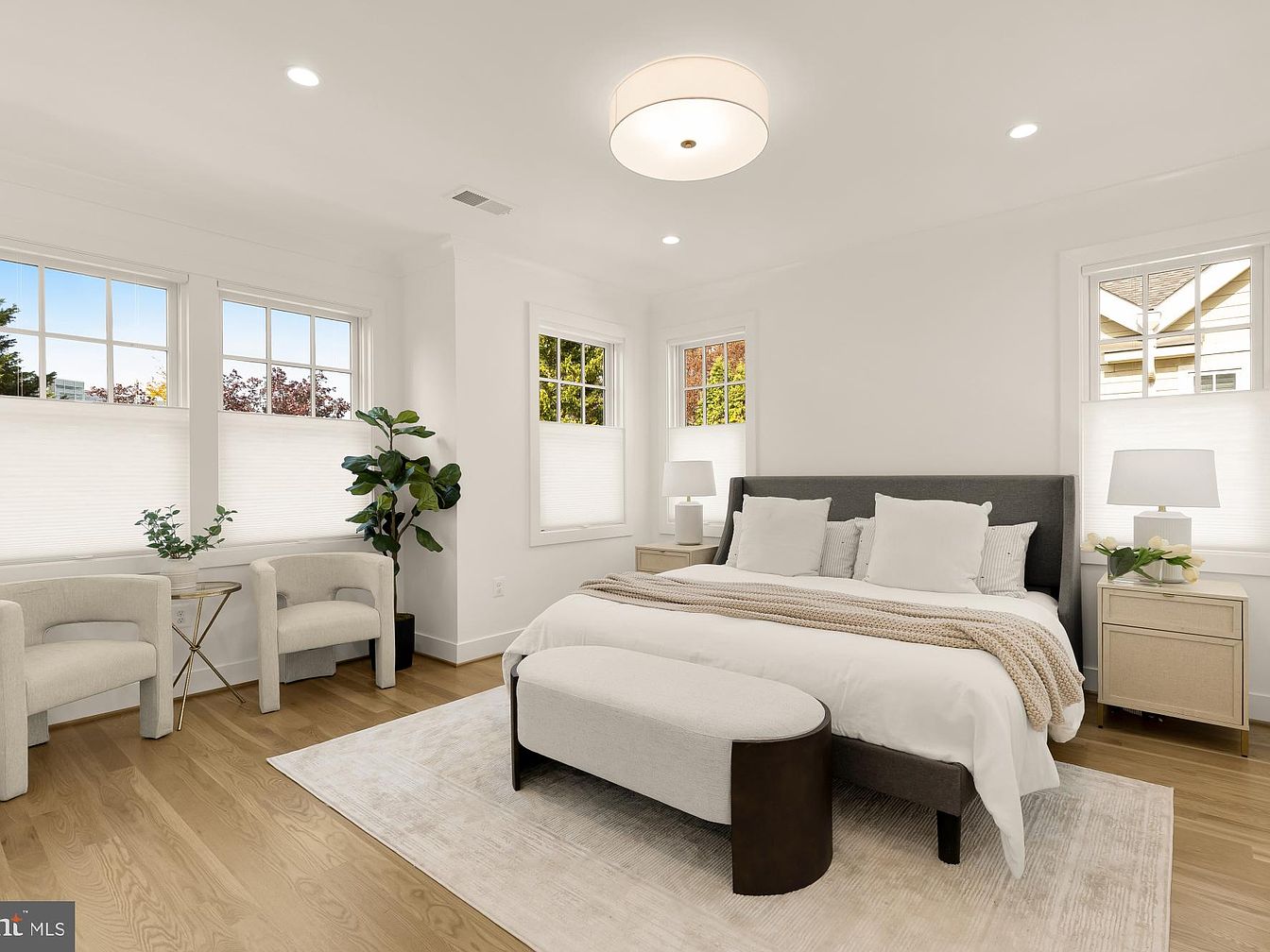 This bedroom features a serene and modern aesthetic with a light color palette. The walls are painted white, complemented by warm hardwood flooring that adds warmth to the space. A plush bed with a dark gray upholstered headboard sits centrally, topped with soft white linens and a textured throw blanket. Flanking the bed are stylish nightstands with lamps, enhancing functionality. Two elegant armchairs near the window provide a cozy nook for relaxation, accompanied by a small table. Natural light floods in through multiple windows, while potted plants inject a touch of greenery, creating a tranquil atmosphere.