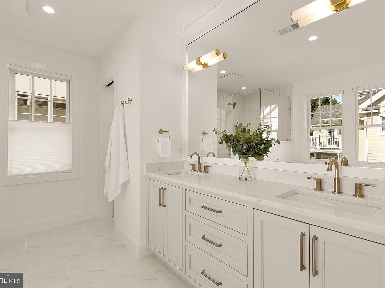 A modern bathroom featuring a spacious double vanity adorned with sleek white cabinetry and gold hardware. The countertop is a smooth, white stone, enhancing the bright ambiance. Above the vanity, a large mirror reflects natural light pouring in from adjacent windows. The walls are painted in soft white, creating a clean and airy feel. Subtle hexagonal tiles cover the floor, adding texture and interest. A lush green plant sits on the countertop, providing a fresh touch against the minimalist backdrop. Stylish light fixtures with gold accents illuminate the space, complementing the overall elegant design.