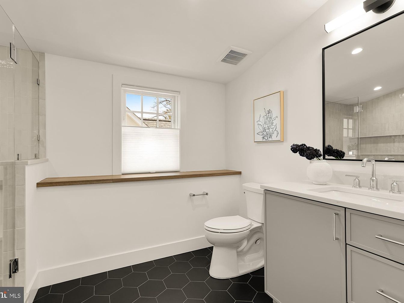 The bathroom features a modern design with clean lines and a fresh color palette. A seamless white wall contrasts with dark hexagonal tiles, enhancing visual interest. The dual vanity has a sleek surface, showcasing a polished chrome faucet above a minimalist sink. A large black-framed mirror expands the space, reflecting ample light from a nearby window fitted with translucent shades for privacy. Floating wooden shelves provide a natural touch, complemented by a decorative vase of dark flowers. Glass panels enclose the shower area, maintaining an airy and open feel, while strategic lighting accents architectural details.