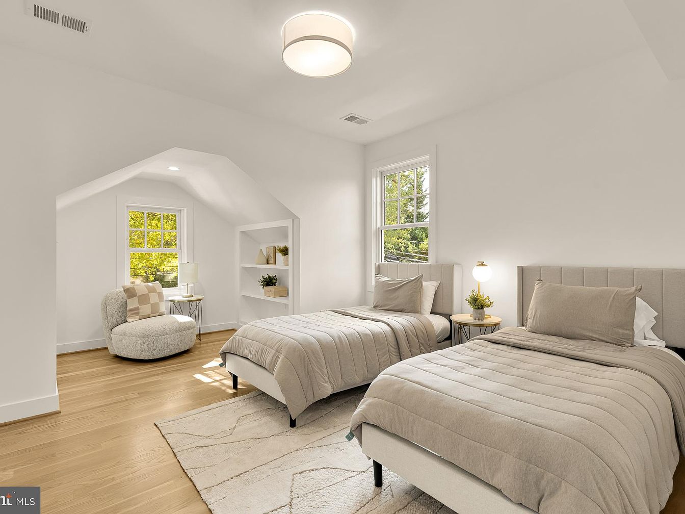This bright bedroom features two elegantly styled beds with soft, beige bedding that complements the tranquil color scheme. The furnishings include a cozy, round armchair in a light fabric, positioned near a small table with a lamp, ideal for reading. A sleek, minimalist bookcase sits against one wall, adorned with a few decorative items and greenery, adding a touch of nature. Natural light floods the room through large windows, highlighted by white trim. The hardwood floors are warm and inviting, while a textured area rug adds depth, enhancing the overall minimalist yet warm aesthetic of the space.