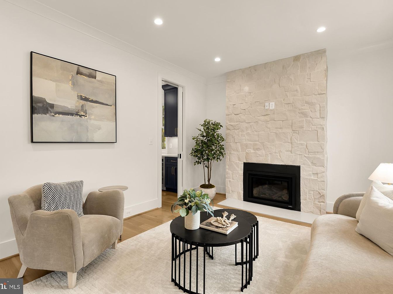 This cozy living room features a warm, inviting atmosphere with a soft color palette dominated by whites and light beige. A large, textured stone fireplace serves as a stunning focal point, contrasting the smooth white walls. To one side, a light beige armchair with a decorative black and white pillow complements the room. A sleek black coffee table, adorned with decorative items, adds a modern edge. Warm wooden flooring enhances the room’s charm, while an artificial plant brings a touch of greenery. The overall design merges contemporary and comfort, making it a perfect space for relaxation.