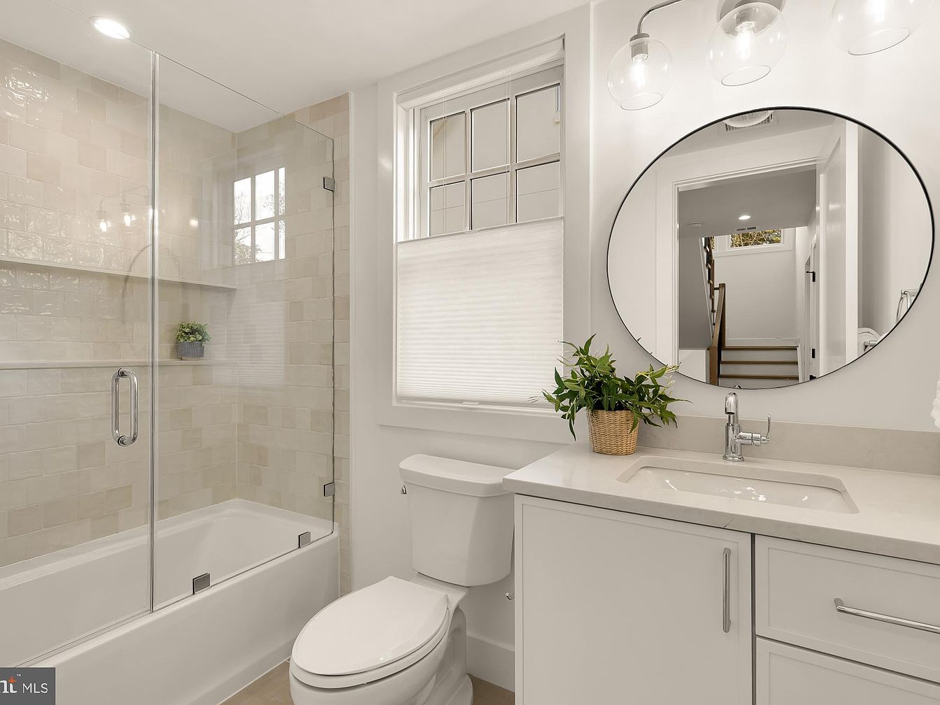 This bathroom features a modern design with clean lines and a soothing color palette of soft whites and beiges. A glass shower enclosure complements a soaking tub, both set against a textured tile wall. The vanity has a minimalist aesthetic, with a light countertop and sleek, white cabinetry. A round mirror adds elegance and depth, reflecting natural light filtering through a window with blinds. Potted greenery on the counter brings a touch of nature, while stylish round light fixtures provide ample illumination, enhancing the overall calm and inviting ambiance of the space.