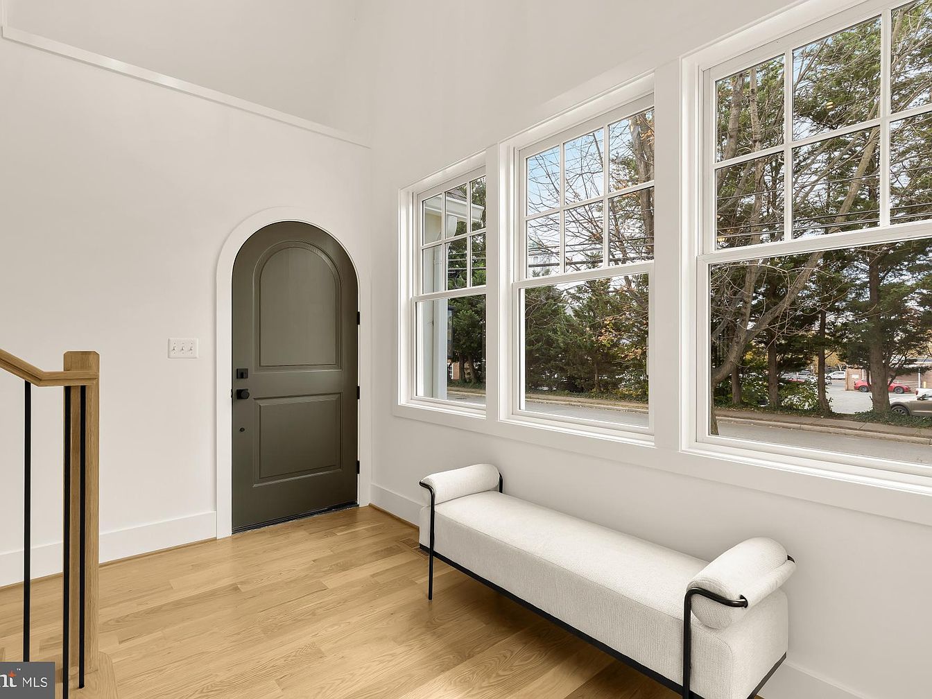 This entryway features a modern design with a warm, inviting atmosphere. The space is brightened by large, multi-pane windows that allow natural light to flow in, highlighting the blond hardwood flooring. A stylish, softly upholstered bench with curling arm details offers seating, complementing the minimalist aesthetic. An elegant arched doorway painted in a deep, muted green serves as the focal point, drawing the eye. The surrounding walls are painted in a crisp white, enhancing the openness of the area. A wooden staircase with black iron railings adds a contemporary touch, seamlessly blending traditional and modern influences.