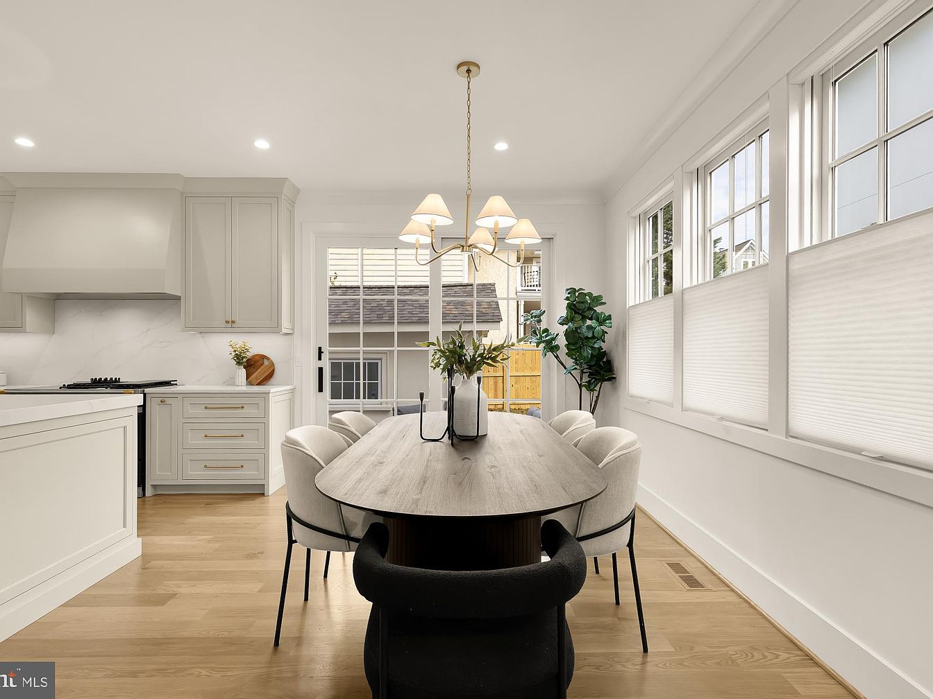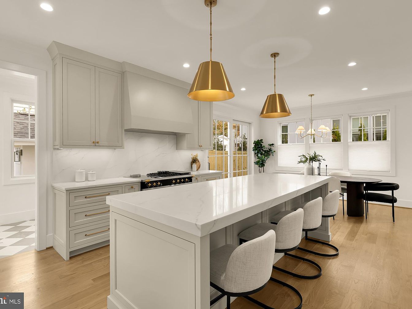 This modern kitchen features a spacious layout emphasizing functionality and elegance. Soft gray cabinetry with brass hardware contrasts beautifully with the white marble countertops. A large island offers additional prep space and incorporates sleek, upholstered bar stools for comfortable seating. Gold pendant lights illuminate the area, adding a warm glow. Large windows flood the room with natural light, while a lush plant enhances the fresh, inviting atmosphere. The transition to a dining area features a circular black table paired with armless chairs, ensuring a seamless flow. Light hardwood flooring completes the cozy yet sophisticated aesthetic.