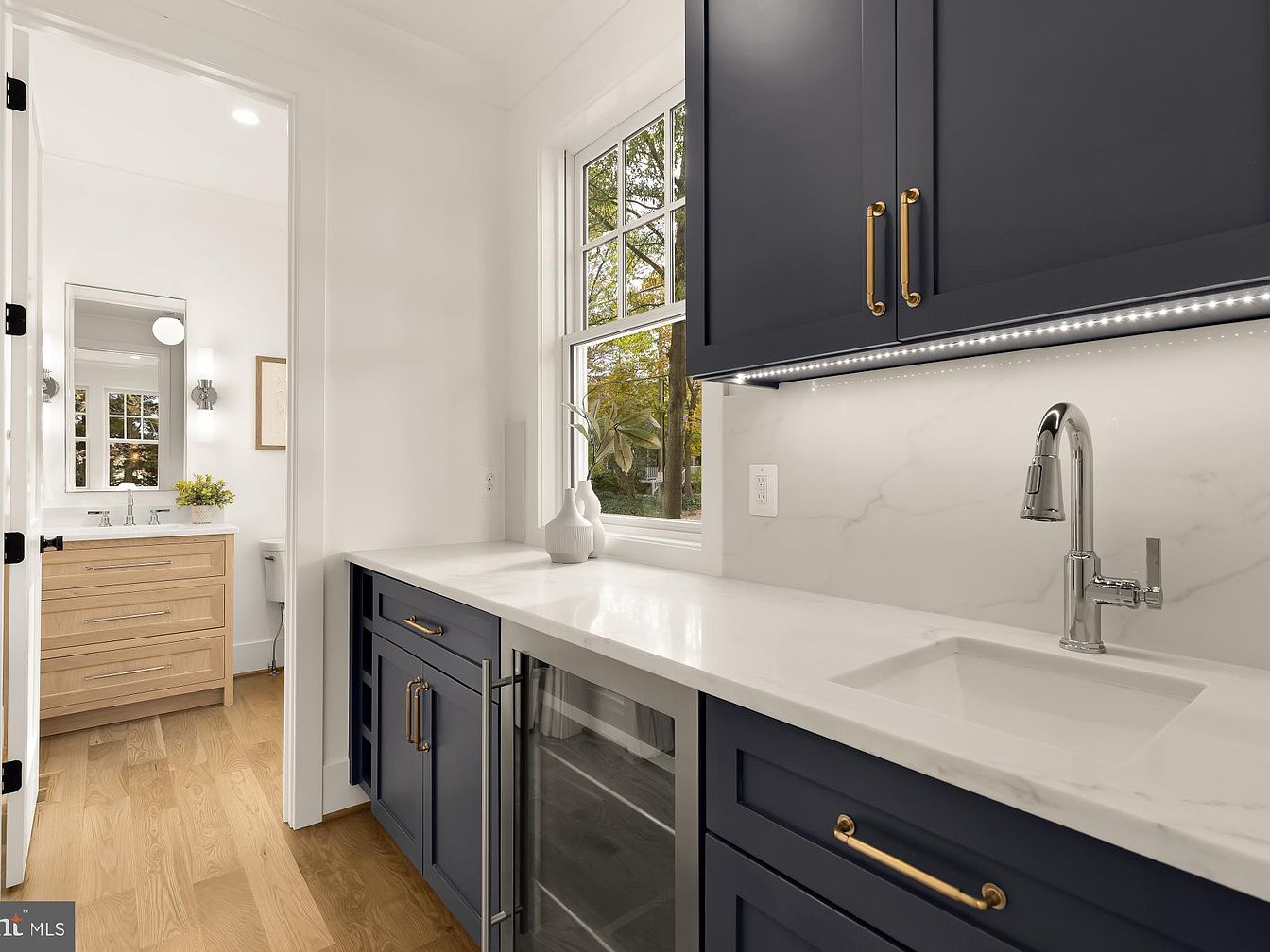 A modern kitchen corner features rich navy cabinetry with sleek gold hardware, adding elegance to the design. A large white countertop with subtle marbling offers ample workspace and complements the cabinetry. Beneath the counter, a wine cooler is integrated seamlessly. Natural light floods in through a window adorned with a view of greenery outside. The adjacent space includes a light wooden vanity with a minimalist mirror and simple wall sconces, enhancing the contemporary aesthetic. The warm oak flooring enriches the overall inviting ambiance, creating a balance of sophistication and comfort throughout the area.