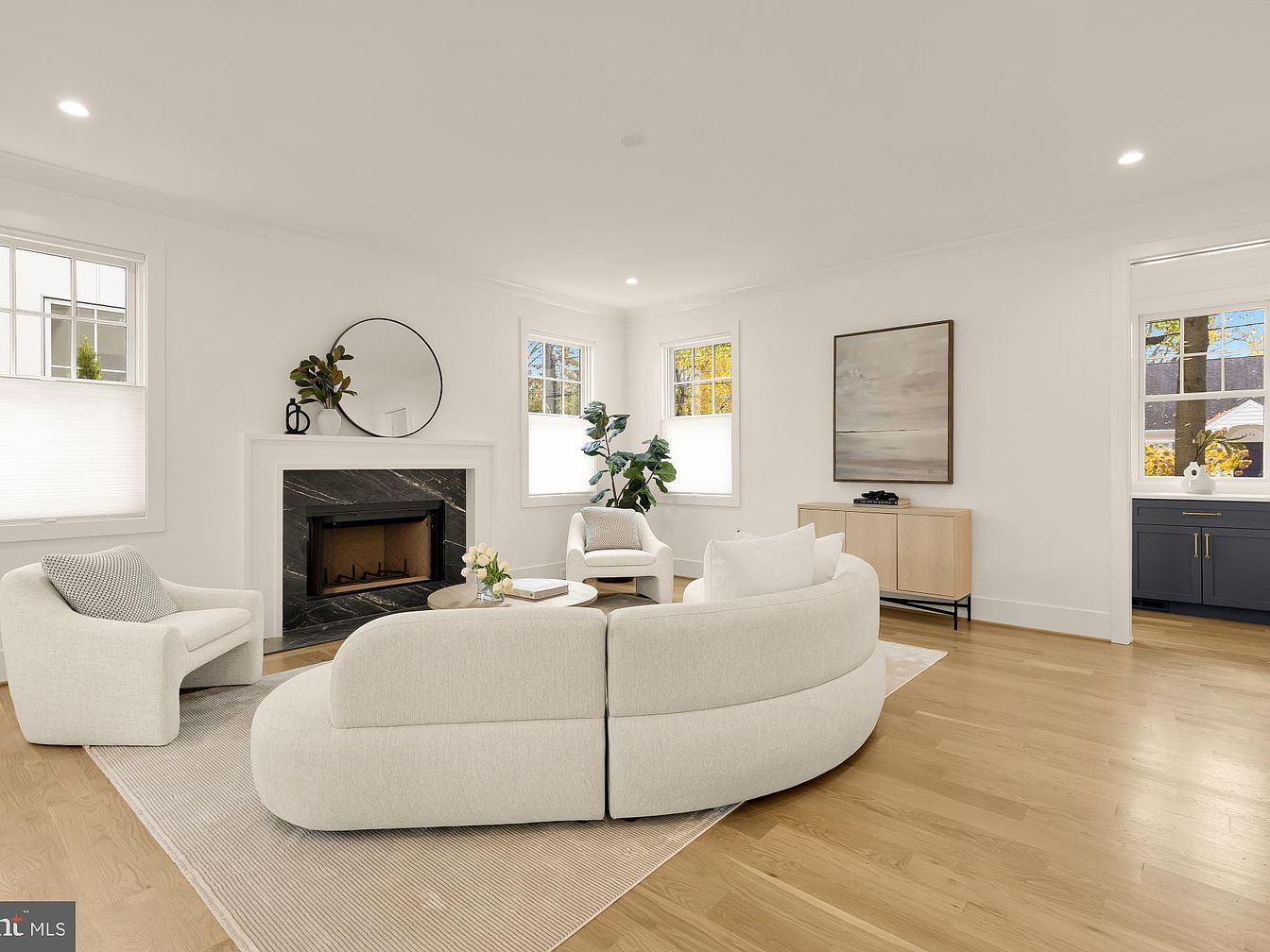 This cozy living room features a soft, neutral color palette predominantly in whites and beiges, creating a serene atmosphere. A circular, plush sofa takes center stage, accompanied by a sleek accent chair. The space is anchored by a dark, marbled fireplace that adds a touch of elegance. Large windows allow ample natural light, framed by simple white blinds. Decor includes a round mirror above the fireplace and a minimalist artwork on the wall, enhancing the aesthetic appeal. A light wooden floor complements the room’s warmth, while a subtle area rug adds texture and comfort underfoot.