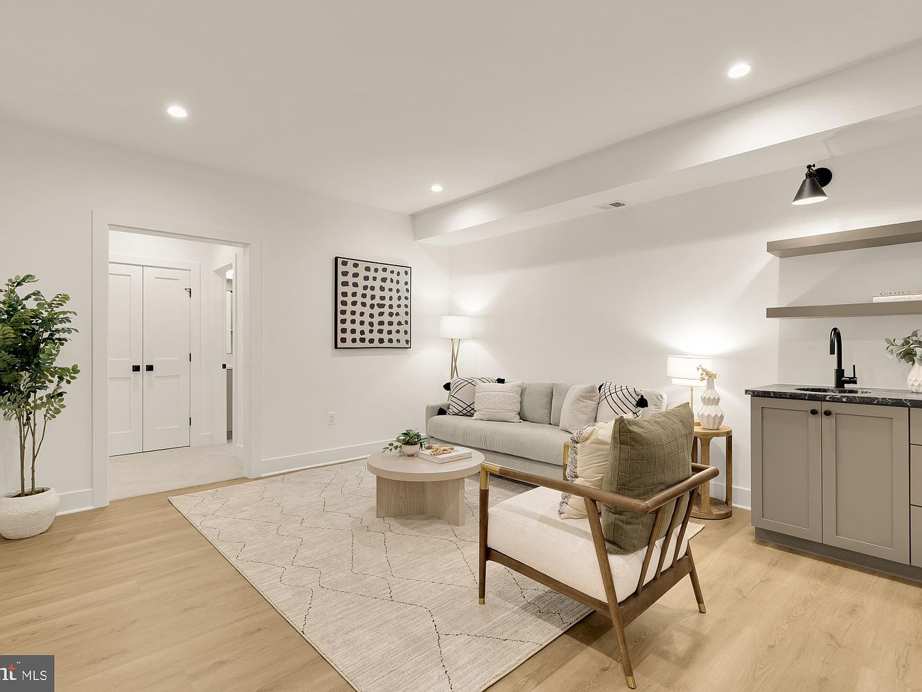 A cozy living room features a light color palette with an emphasis on neutral tones. A plush, beige sectional sofa is adorned with patterned cushions, positioned to create an inviting atmosphere. A minimalist coffee table sits at the center, complemented by a soft area rug that extends across the wooden floor, adding warmth. To the side, a mid-century modern chair provides additional seating. Sleek cabinetry with a dark countertop overhang serves as a practical bar area. Natural light filters in, enhanced by contemporary wall lighting and a decorative framed art piece, creating an overall harmonious and stylish ambiance.