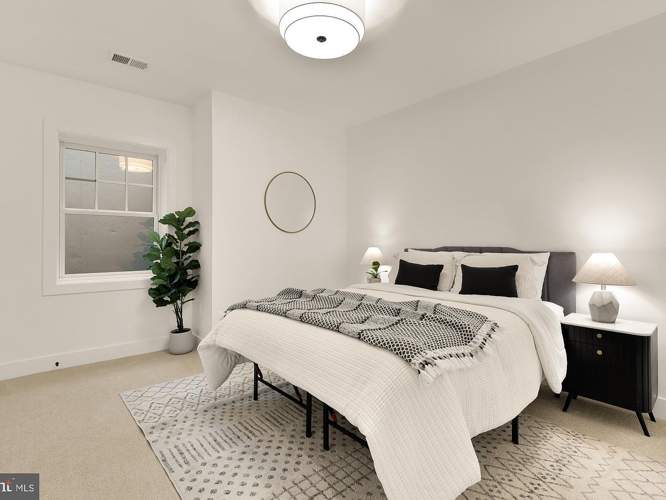 A serene bedroom showcasing a modern aesthetic with crisp white walls that enhance the spacious feel. The neatly made bed features a textured white comforter paired with contrasting black accent pillows. A geometric patterned throw adds depth and warmth. A sleek, dark nightstand with unique detailing complements a stylish lamp, softly illuminating the space. Natural elements are introduced through a potted plant positioned beside a window, bringing a hint of greenery. The light-colored carpet enhances comfort while the diamond-patterned area rug ties the design together, creating a cozy yet contemporary atmosphere ideal for relaxation.