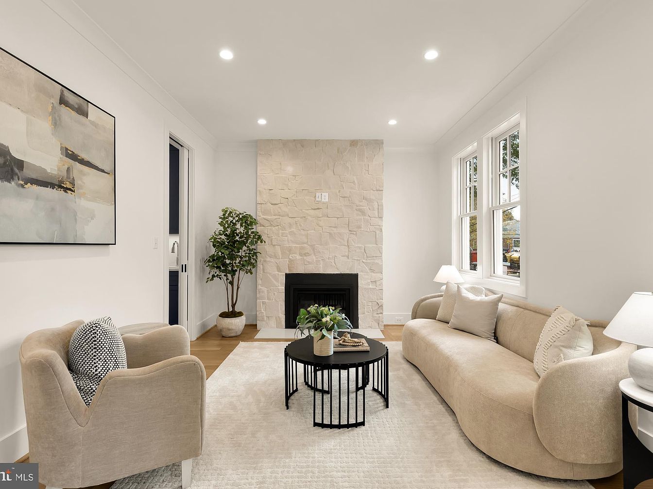 A cozy living room featuring soft beige and white tones. A contemporary curved sofa invites relaxation, complemented by a uniquely designed armchair holding a decorative pillow. A circular black coffee table sits centrally, adorned with a small vase of greenery, enhancing natural aesthetics. The textural appeal of the stone fireplace, framed by a minimalist white wall, acts as a focal point. Large windows allow ample light to flood in, accentuating the room’s airy feel. A tasteful abstract artwork adds a splash of color, while potted plants introduce an organic element, enriching the inviting atmosphere.