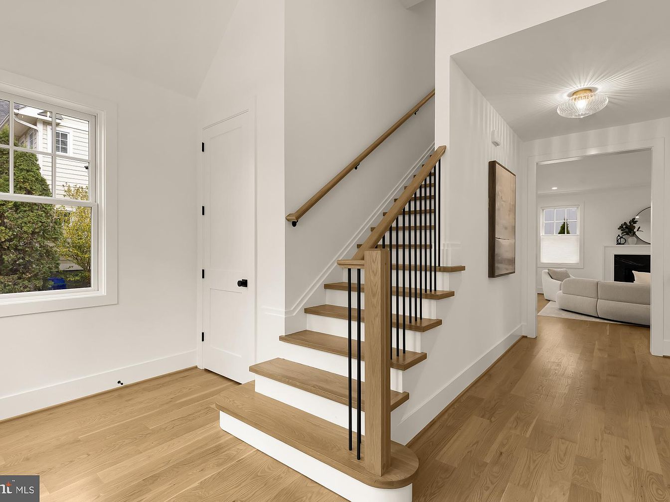This entryway features a bright, airy atmosphere characterized by light-colored walls and elegant wood finishes. The staircase, with its natural wood treads and sleek black metal balusters, leads smoothly to the upper floor, enhancing the modern aesthetic. A large window allows natural light to flood in, illuminating the polished hardwood flooring. On the right, a simple white door blends seamlessly with the surroundings, complemented by a black door handle. Artfully placed against the wall, a framed artwork adds a touch of sophistication. The overall design balances warmth with contemporary style, setting a welcoming tone for the home.