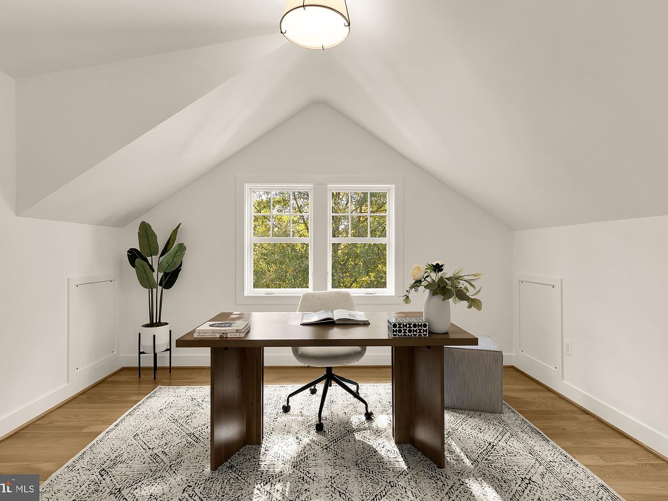 This cozy home office features a steeply pitched ceiling, enhancing the sense of space. The walls and ceiling are painted white, creating a bright, airy atmosphere. A large window lets in natural light, framed by simple white trim, with views of lush greenery outside. A minimalist wooden desk anchors the room, paired with a modern rolling chair. A circular ceiling light provides additional illumination. A textured area rug adds warmth beneath the desk, while a potted plant in the corner brings a touch of nature indoors. Subtle architectural details include built-in storage, maintaining a clean aesthetic.