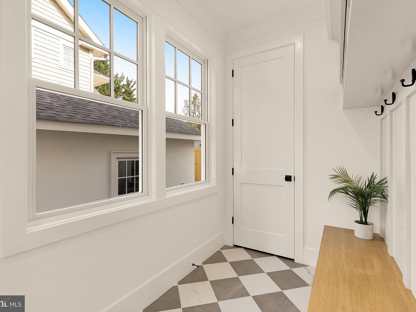This mudroom features a spacious layout characterized by crisp white walls and large windows allowing natural light to flood the space. The tiled floor features a contemporary black-and-white checkered pattern adding visual interest. A minimalist wooden bench runs along one wall, providing a practical seating area for removing shoes. Above the bench, a simple shelf equipped with hooks offers an organized space for coats, bags, and accessories. The overall design is clean and functional, with a green plant in a planter adding a touch of nature, harmonizing the aesthetic with both modern and rustic elements.
