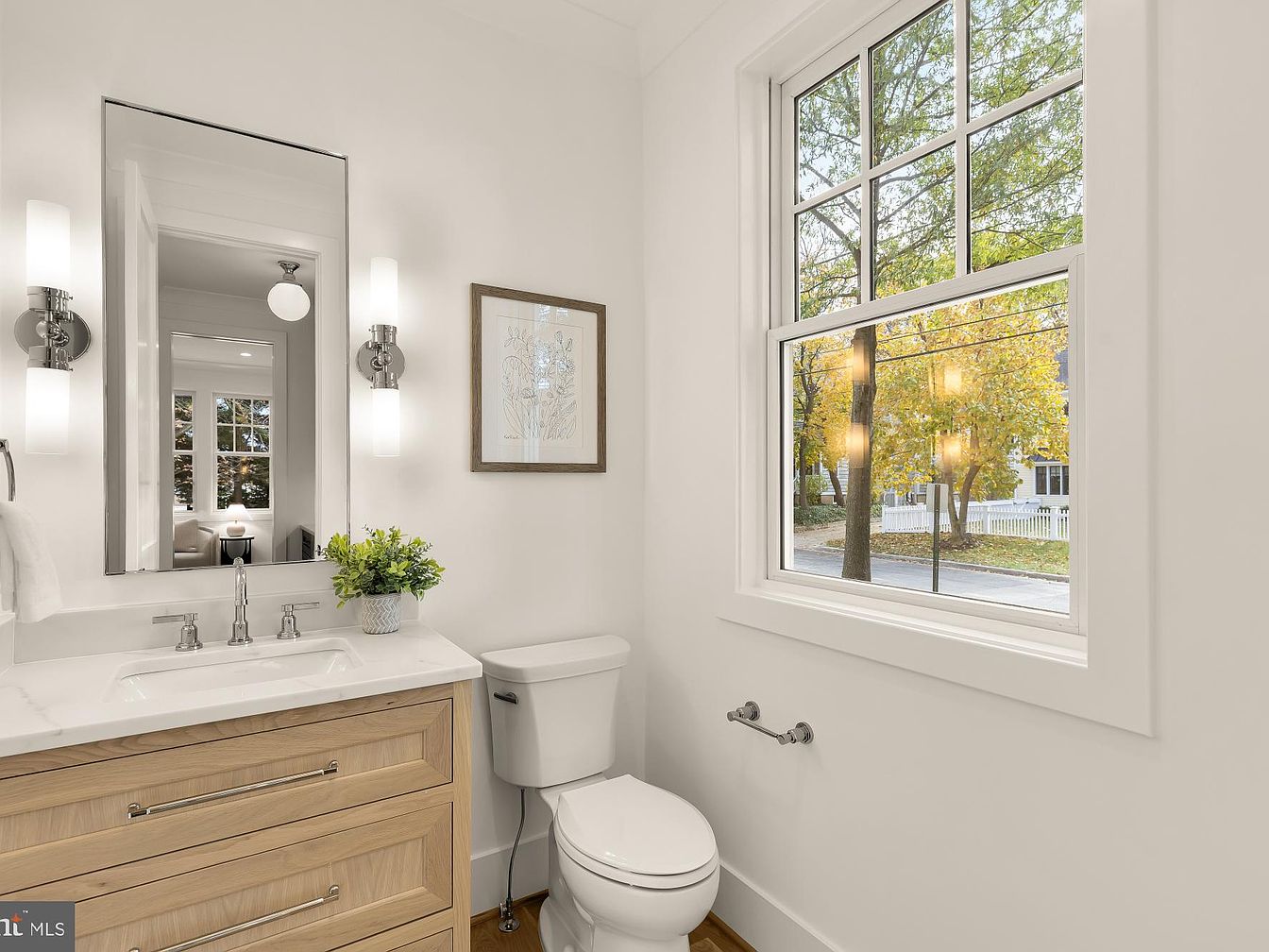 A modern bathroom featuring a double sink vanity with a sleek white countertop and warm wooden cabinetry. The polished chrome faucets add a touch of elegance. Above the sinks, dual wall-mounted sconces provide soft illumination alongside a large rectangular mirror, enhancing the space’s brightness. The neutral white walls create a clean aesthetic, while the window offers a view of autumn foliage outside, bringing nature indoors. A minimalist artwork in a wooden frame adds character. The porcelain toilet sits quietly nearby, and a small potted plant inserts a fresh, vibrant touch to this tranquil bathroom environment.