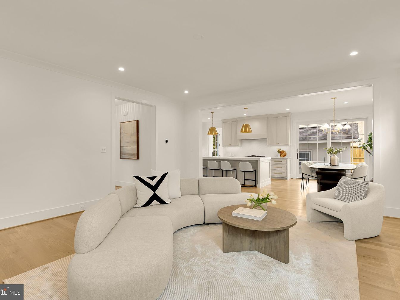 This spacious living room features a contemporary, curved sectional sofa in a soft cream hue, accented by a black and white geometric pillow. A round wooden coffee table sits centrally, with a small plant adding a pop of greenery. Natural light floods in from a large opening leading to the kitchen area, enhancing the airy feel. The light oak flooring contrasts beautifully with the white walls and ceiling, emphasizing a modern aesthetic. Simple pendant lights hang above the kitchen bar, while the dining area is visible in the background, showcasing a clean, minimalist design throughout.