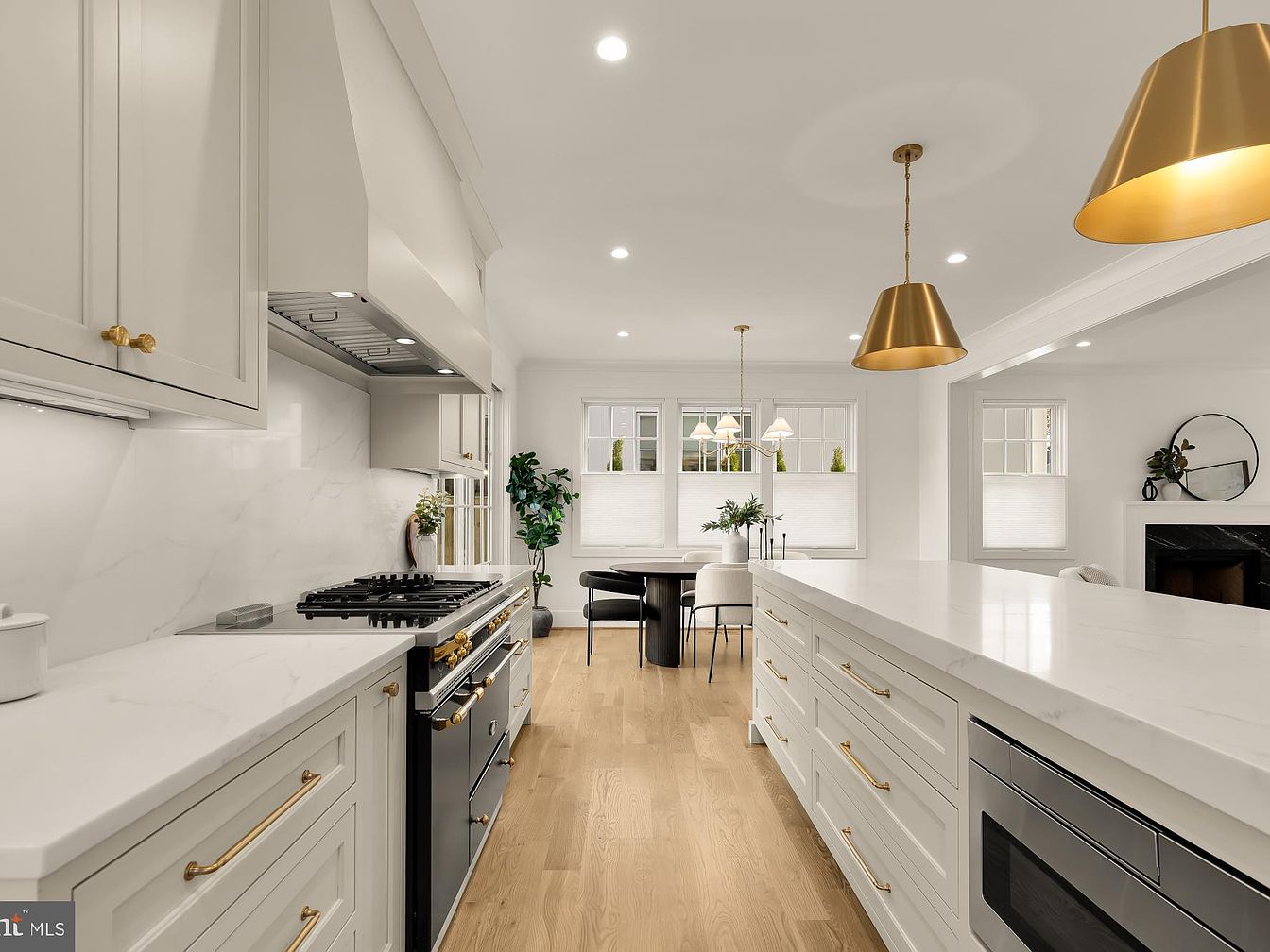 This modern kitchen features a spacious layout with an expansive marble countertop and cabinetry in soft gray tones, complemented by gold hardware. A professional-grade black stove stands out against the marble backsplash. Elegant pendant lights hang over the counter, providing warm illumination. To the right, a dining area is arranged with a round table surrounded by sleek black chairs, and large windows allow natural light to flood the space. A potted plant adds a touch of greenery, enhancing the inviting atmosphere. The light wooden flooring grounds the room, contributing to a harmonious blend of contemporary design.
