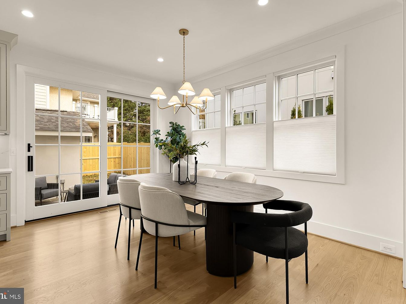 The dining area features a modern design with an oval table that serves as the focal point, surrounded by sleek chairs in contrasting fabrics, creating a warm yet sophisticated ambiance. A stylish chandelier hangs above, providing soft illumination. Large glass doors lead to an outdoor space, enhancing natural light and connectivity with nature. The walls are painted in a crisp white, complementing the light wood flooring, which adds warmth. Minimalist decor, including a greenery centerpiece, further emphasizes simplicity and elegance while maintaining an inviting atmosphere, perfect for entertaining or casual gatherings.