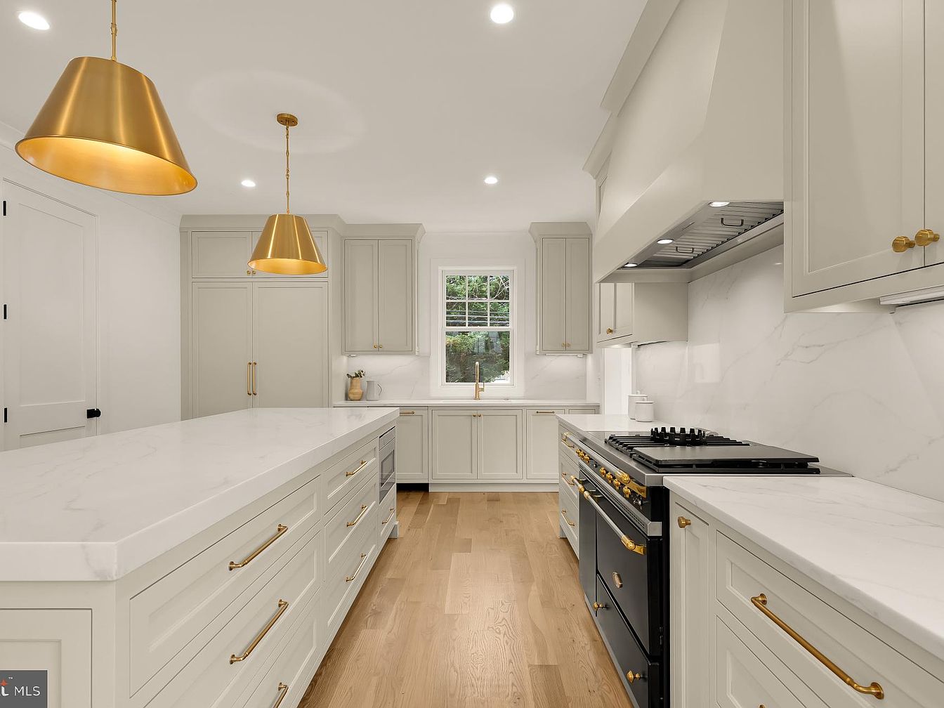 This modern kitchen features a spacious layout with an expansive island at its center, topped with a sleek white marble surface. The cabinetry showcases a soft gray tone, adding warmth, while gold hardware punctuates the design with elegance. Two contemporary golden pendant lights hang above the island, enhancing the inviting atmosphere. A black range stove stands out against the light hues, suggesting a professional touch. Natural light filters through the window, illuminating the space and highlighting the subtle textures of the marble backsplash. Smooth wood flooring complements the overall aesthetic, creating a harmonious, sophisticated environment.