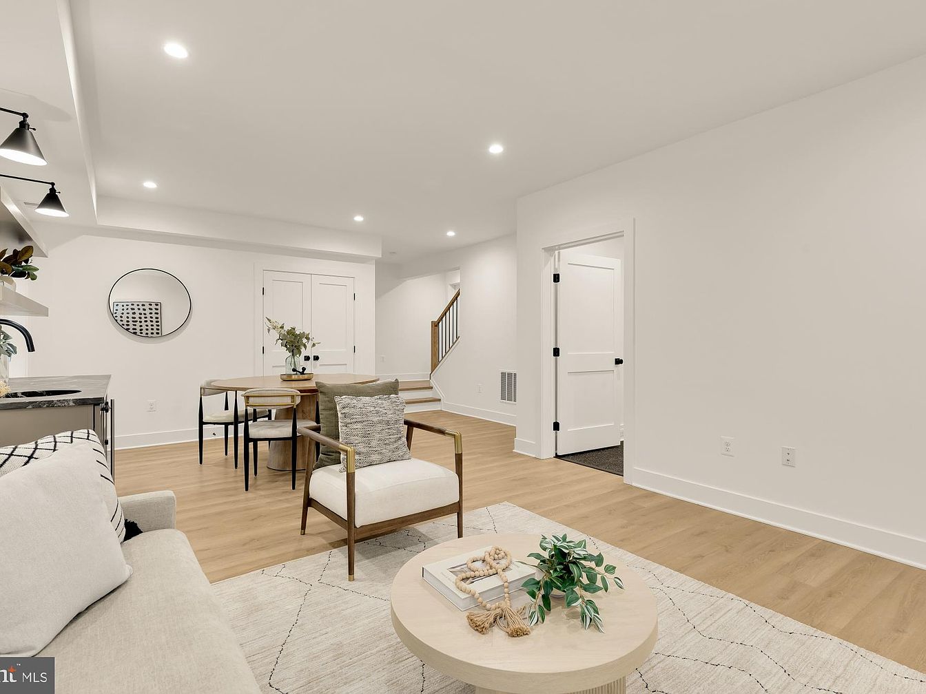 This living room features a spacious, open layout with clean lines and modern appeal. The color scheme revolves around soft neutrals, creating a calming atmosphere. A light-colored sofa adorned with geometric pillows complements the warm-toned wooden floor. A round wooden coffee table sits centrally, decorated with greenery and decorative elements. A circular mirror hangs above a small table, reflecting light and adding depth, while a cluster of dining chairs and a sleek dining table encourage social interaction. Architectural details include smooth white walls and contemporary lighting fixtures that enhance the overall brightness and elegance of the space.