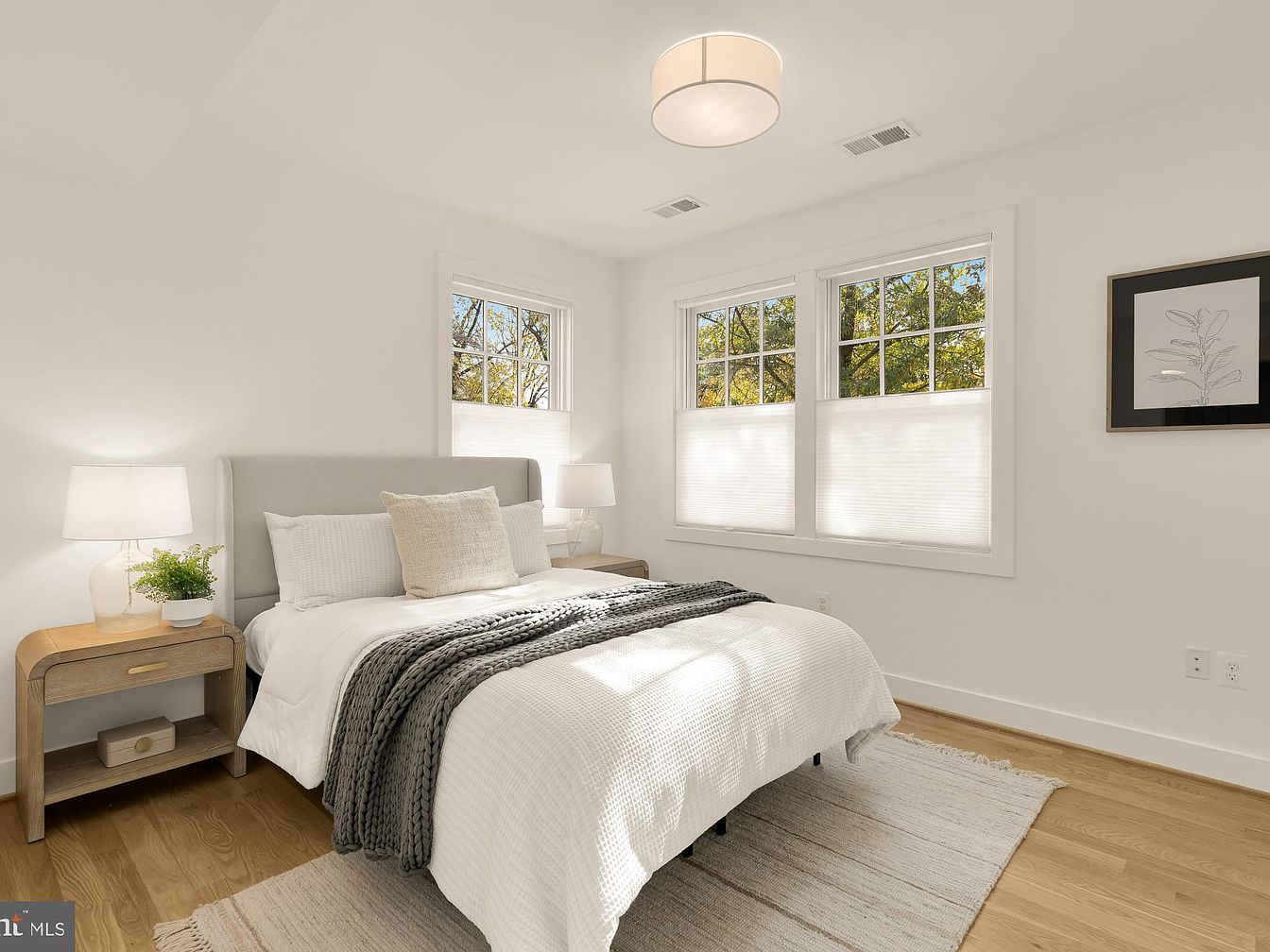 This bedroom features a serene and minimalist design, enhanced by light-colored walls and warm hardwood flooring. The bed, dressed in a cozy white duvet and textured gray throw, invites comfort. Flanking the bed are two sleek nightstands with soft white lamps offering gentle lighting. Natural light floods the space through two well-framed windows, adorned with simple blinds to maintain privacy while showcasing outdoor greenery. A neutral area rug anchors the room, adding warmth and texture. A framed botanical print adds a touch of elegance, completing this tranquil, inviting atmosphere that promotes relaxation and tranquility.