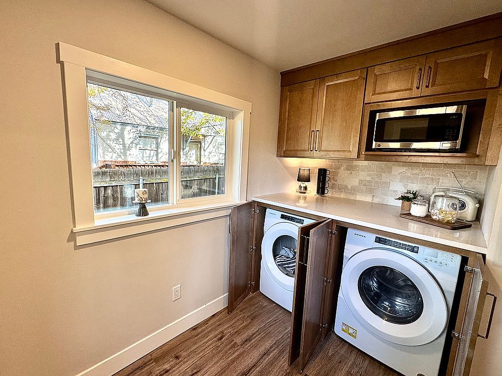 The laundry room features a functional layout with a warm, inviting design. Light-colored walls contrast with rich wooden cabinetry that provides ample storage. The countertop, extending over the appliances, offers a practical workspace for folding. Two modern washing machines with front-loading doors sit prominently below the countertop, enhancing efficiency. A large window allows natural light to fill the space, framed by simple white trim that adds brightness. Decorative elements, including a small lamp and potted plants, introduce personality. The hardwood floor complements the cabinetry, providing a cohesive aesthetic that blends style and practicality in this utility space.