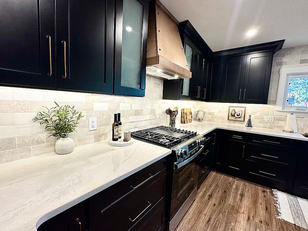 A modern kitchen featuring sleek black cabinetry with gold hardware, providing a striking contrast against light, textured tile backsplash. The countertop is a polished white stone, complementing the upper cabinets adorned with glass inserts. A stainless-steel range sits prominently, flanked by butcher block cutting boards and decorative glassware. A subtle plant adds a fresh touch on the counter, while an olive oil bottle emphasizes culinary inspiration. Natural light filters in through a window, enhancing the warm wood flooring, which ties together the cozy yet sophisticated ambiance of the space.