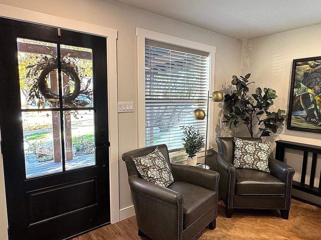 This entrance hallway features a striking black front door adorned with a beautiful wreath, providing a warm welcome. Light streams through the large window beside the door, illuminating the space. The walls are painted in a soft cream, enhancing the natural light. Each of the two leather chairs is accented with decorative pillows showcasing a floral design, adding a touch of elegance. A tall, slender floor lamp with a gold orb lights the corner, and potted greenery offers a refreshing organic contrast to the modern décor. The wooden flooring adds warmth, completing the inviting atmosphere.