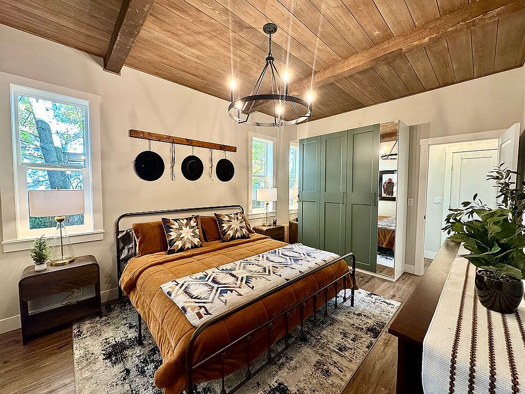The bedroom features a warm, inviting design with a blend of rustic and contemporary elements. A metal frame bed is highlighted by a rich, terracotta-colored blanket and patterned throw pillows. Natural light pours in from two windows framed by white trim, showcasing a serene view. Above the bed, a wooden rack holds black circular plates, adding character. A stylish, dark wood nightstand, paired with a modern lamp, sits beside the bed. Green sliding doors, providing storage space, contrast beautifully with the light walls and wood flooring. Decorative plants enhance the fresh, cozy atmosphere.