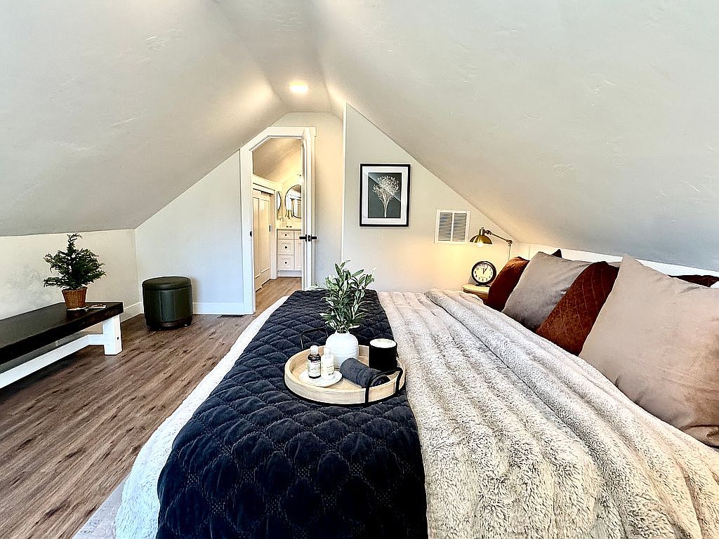 This cozy loft bedroom features a sloped ceiling, enhancing its charming, intimate feel. The walls are painted a soft white, complementing the warm wooden flooring. A plush bed with layered blankets takes center stage, flanked by accent pillows in deep reds and earthy tones. A minimalist bedside table holds a decorative plant, adding a touch of greenery. To the left, a contemporary armchair invites relaxation, alongside a small table. The room also provides access to a bathroom, seen through a stylish archway, emphasizing functional elegance. Soft lighting fixtures enhance the serene ambiance, perfect for restful nights.