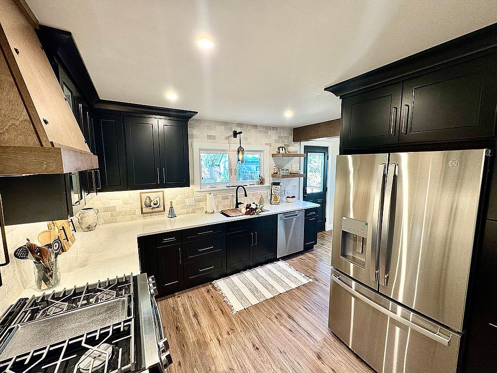 This modern kitchen features a sleek design with elegant black cabinetry paired with a contrasting light marble countertop. The matte black cabinets offer a sophisticated touch, while a wooden hood adds warmth. Stainless steel appliances, including a large refrigerator and a professional-grade stove, enhance functionality. A neutral-toned tiled backsplash complements the countertop, creating a cohesive look. Natural light streams through the window, illuminating small decorative elements on open shelves. The flooring is a warm wood finish, providing a rustic feel. Overall, the space balances modern aesthetics with inviting warmth, making it a stylish and practical kitchen.