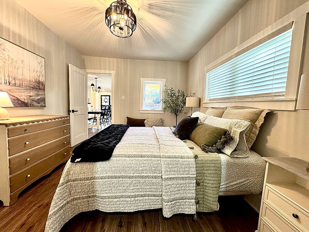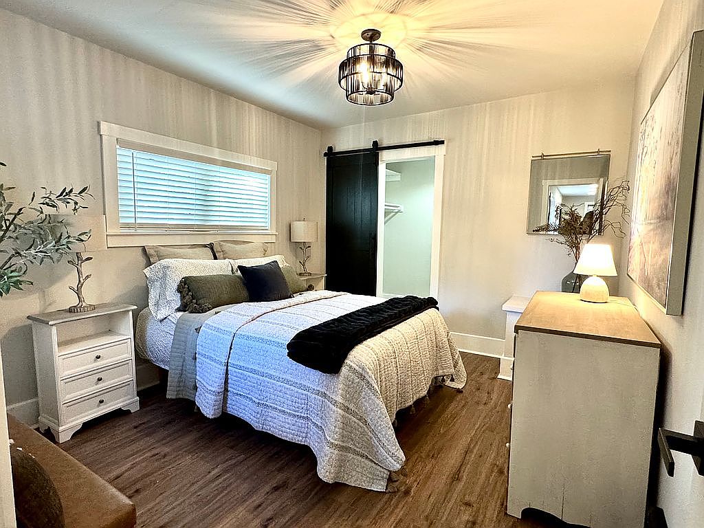 This cozy bedroom features a warm and inviting atmosphere. A soft, neutral color palette enhances the serene feel, with light gray walls and rich wooden flooring. The bed, adorned with a textured, patterned quilt, is flanked by simple white nightstands topped with stylish lamps, providing gentle illumination. A sliding barn door adds a rustic touch, leading to the closet area. Light filters through the window, adorned with horizontal blinds, ensuring privacy while letting in natural light. A slender plant beside the bed introduces a hint of greenery, enhancing the room’s tranquil aesthetics.