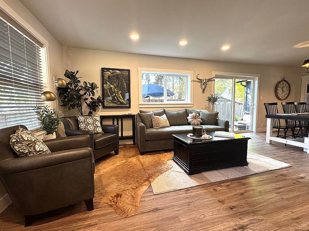 This cozy living room features a blend of modern and rustic elements. A soft, grey sofa anchors the space, complemented by dark leather chairs adorned with textured pillows. A coffee table, dark wood with a sleek design, sits on a neutral patterned rug, adding warmth to the hardwood flooring. Natural light filters through large windows, brightening the room and creating an inviting atmosphere. Decorative plants enhance the lively ambiance, while framed artwork on the walls introduces a splash of color. The open layout leads to a dining area, seamlessly connecting spaces for comfort and functionality.