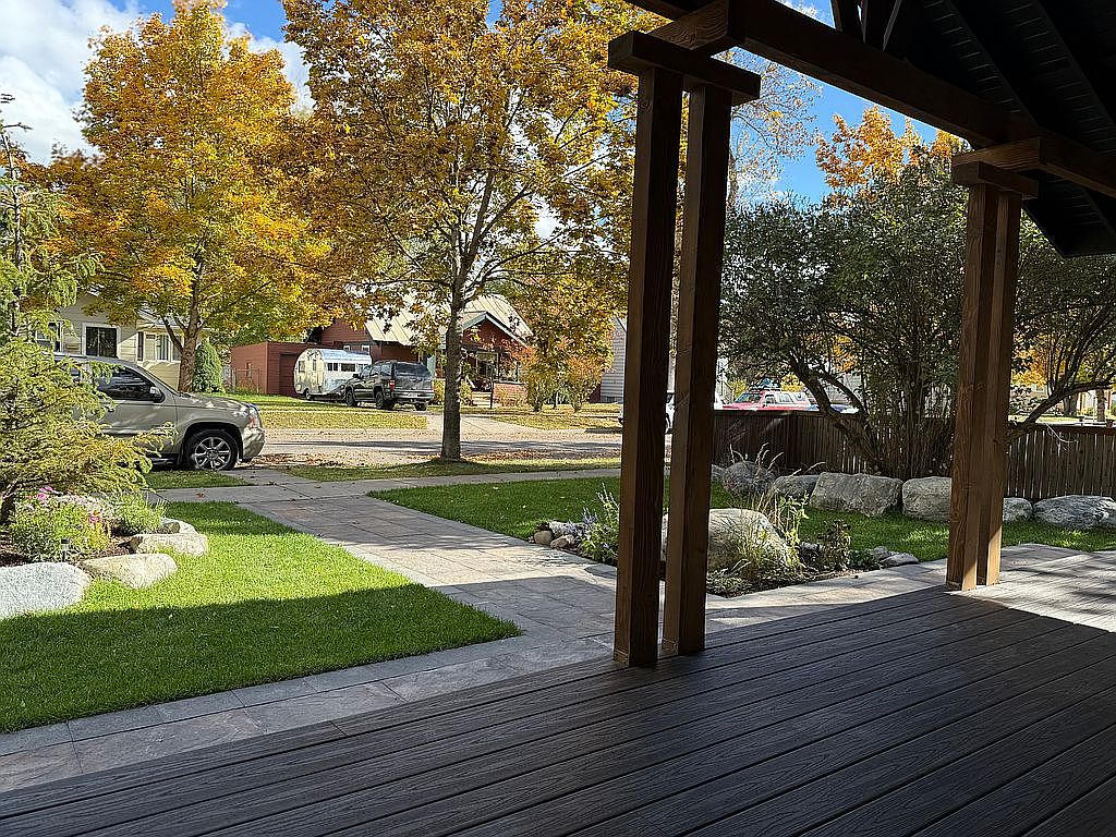 The front porch showcases a spacious, welcoming area with rich wooden beams supporting the roof. A clean, textured wooden floor complements the natural surroundings. Lush green grass stretches across the yard, bordered by neatly laid stone pathways and vibrant flowerbeds. Autumn leaves adorn the trees, creating a colorful backdrop of yellows and oranges. In the distance, parked vehicles and charming neighboring houses peek through the foliage, enhancing the neighborhood’s inviting character. The overall aesthetic merges rustic charm with natural beauty, providing a serene entry point to the home.