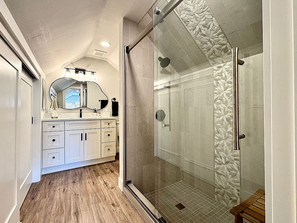 A cozy bathroom space featuring a sleek, contemporary design. The sloped ceiling adds character, while the soft, natural light filters through the window next to the ornate, oval mirror. White cabinetry contrasts beautifully with the warm, wood-like floor, offering both style and functionality. A glass shower enclosure showcases elegant tile work, accented by a decorative strip of leaf patterns that adds a touch of sophistication. The minimalist black fixtures enhance the modern aesthetic, complemented by a small wooden stool that provides warmth and texture. This bathroom perfectly balances comfort with a refined, stylish atmosphere.