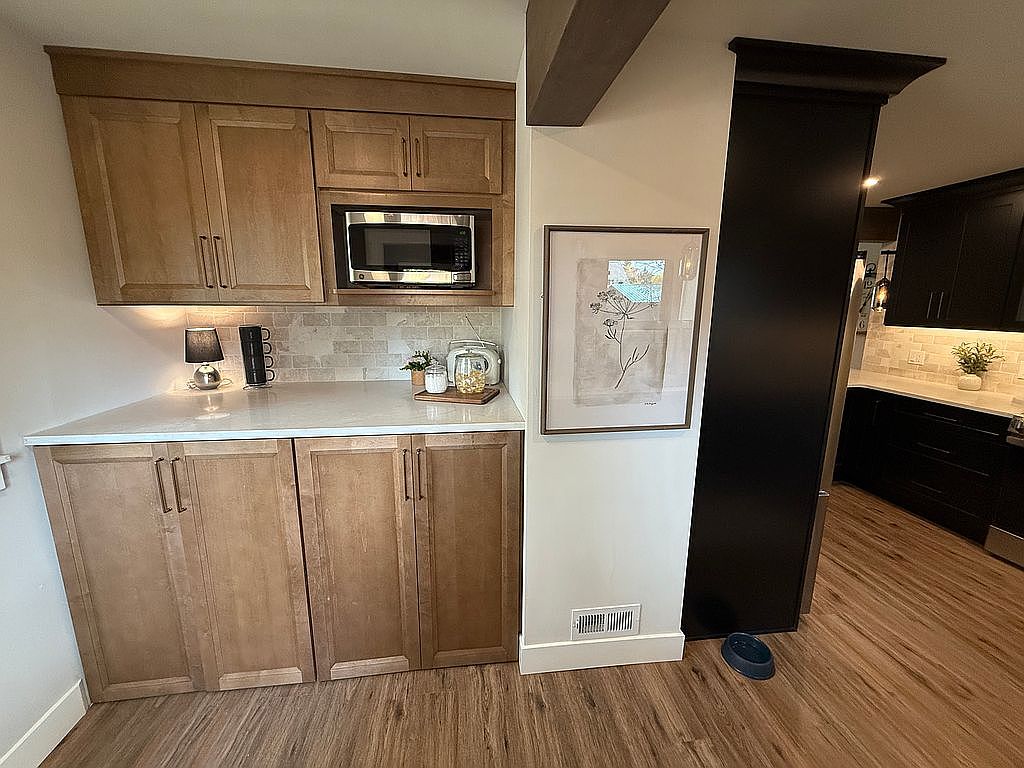 This kitchen corner features light wood cabinetry with a modern finish, creating a warm and inviting atmosphere. The countertops are a bright, polished white, contrasting against the darker black cabinetry visible in the background. A sleek stainless steel microwave is tucked beneath the cabinets, seamlessly integrating into the design. Soft ambient lighting from a small lamp adds a cozy feel, while a framed artwork of a bird adorns the wall, introducing a touch of nature. The flooring is a rich, warm wood, enhancing the organic vibe and complementing the overall color scheme.