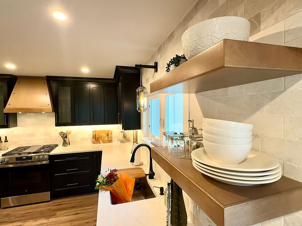The kitchen features sleek black cabinetry, showcasing a modern aesthetic. A light-colored stone backsplash complements the dark cabinets, creating a striking contrast. Open wooden shelves display carefully arranged white dinnerware and glass containers, adding both function and style. The kitchen island is equipped with a stylish sink and a modern faucet, enhancing accessibility and functionality. Natural light floods in through multiple windows, brightening the space. A large stainless steel stove with a wooden range hood serves as a focal point, harmonizing with the warm wood flooring, which adds an inviting warmth to the overall design.