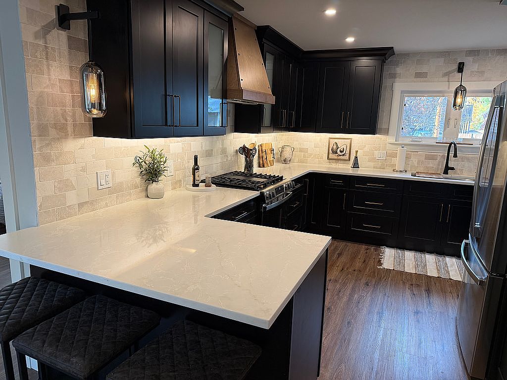 The kitchen features a modern design with dark wood cabinetry and contrasts against a light-colored quartz countertop. The backsplash is composed of creamy, textured tiles, adding warmth and depth. A sleek black range is positioned against the cabinetry, with an elegant vent hood above. Pendant lights hang stylishly, illuminating workspaces. In the foreground, a breakfast bar with black, quilted stools offers casual seating. A small ceramic vase and assorted utensils provide functional decor on the countertop. Natural light filters in through a window, highlighting the rich tones of the wood flooring, enhancing the inviting atmosphere.
