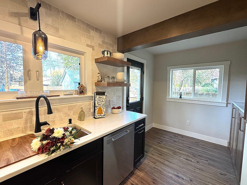 This kitchen area features a modern yet cozy aesthetic, highlighted by a mix of rustic and contemporary elements. The backsplash exhibits a textured beige brick pattern, complementing the white quartz countertop. A sleek black faucet stands out against the light-toned surfaces. Above, a stylish pendant light casts a warm glow, enhancing the inviting atmosphere. Open shelving displays neatly arranged dishware, adding a touch of farmhouse charm. Natural light floods in through two large windows, framing views of the outdoors. The warm wood flooring ties the space together, creating a harmonious blend of functionality and comfort.