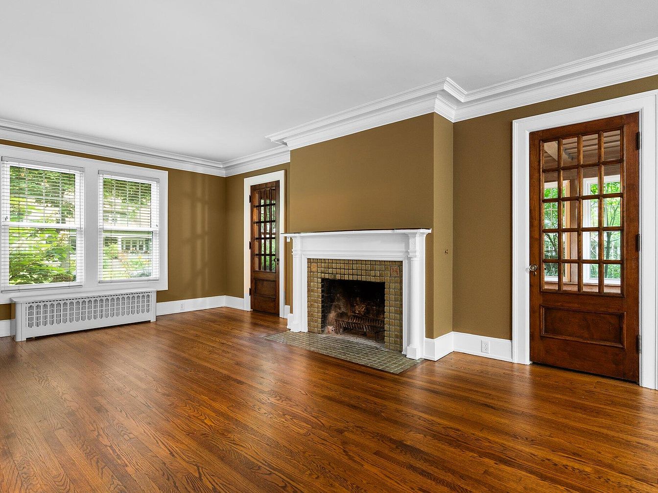 This living room features rich hardwood flooring that enhances its warm, inviting atmosphere. The walls are painted a soft beige, contrasted by white crown molding and trim, offering a classic look. Natural light floods in through large, multi-pane windows, showcasing views of the outdoors. A built-in bookshelf stands to one side, providing a functional and aesthetic touch. Elegant double doors with glass panels lead to another room, adding depth to the space. A decorative white radiator beneath the windows complements the overall design while a simple ceiling fixture provides illumination, maintaining the room’s vintage charm.