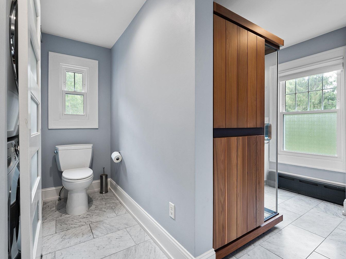 This bathroom features a modern design with a calming blue color scheme. The walls are painted in a soft blue, complementing the white trim and bright window. A sleek, low-profile toilet is positioned against one wall, while the adjacent space showcases a stylish glass shower with an elegant wooden accent. Large, light gray marble tiles cover the floor, enhancing the room’s openness. Natural light floods in through a large window, decorated with a subtle privacy film, adding to the serene atmosphere. The combination of contemporary and natural materials creates a refreshing, inviting space.