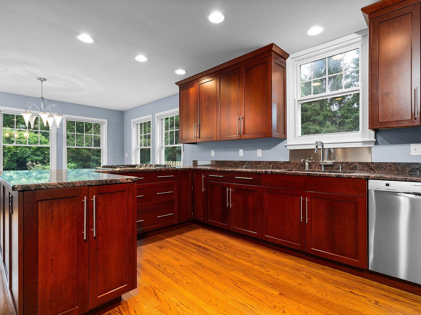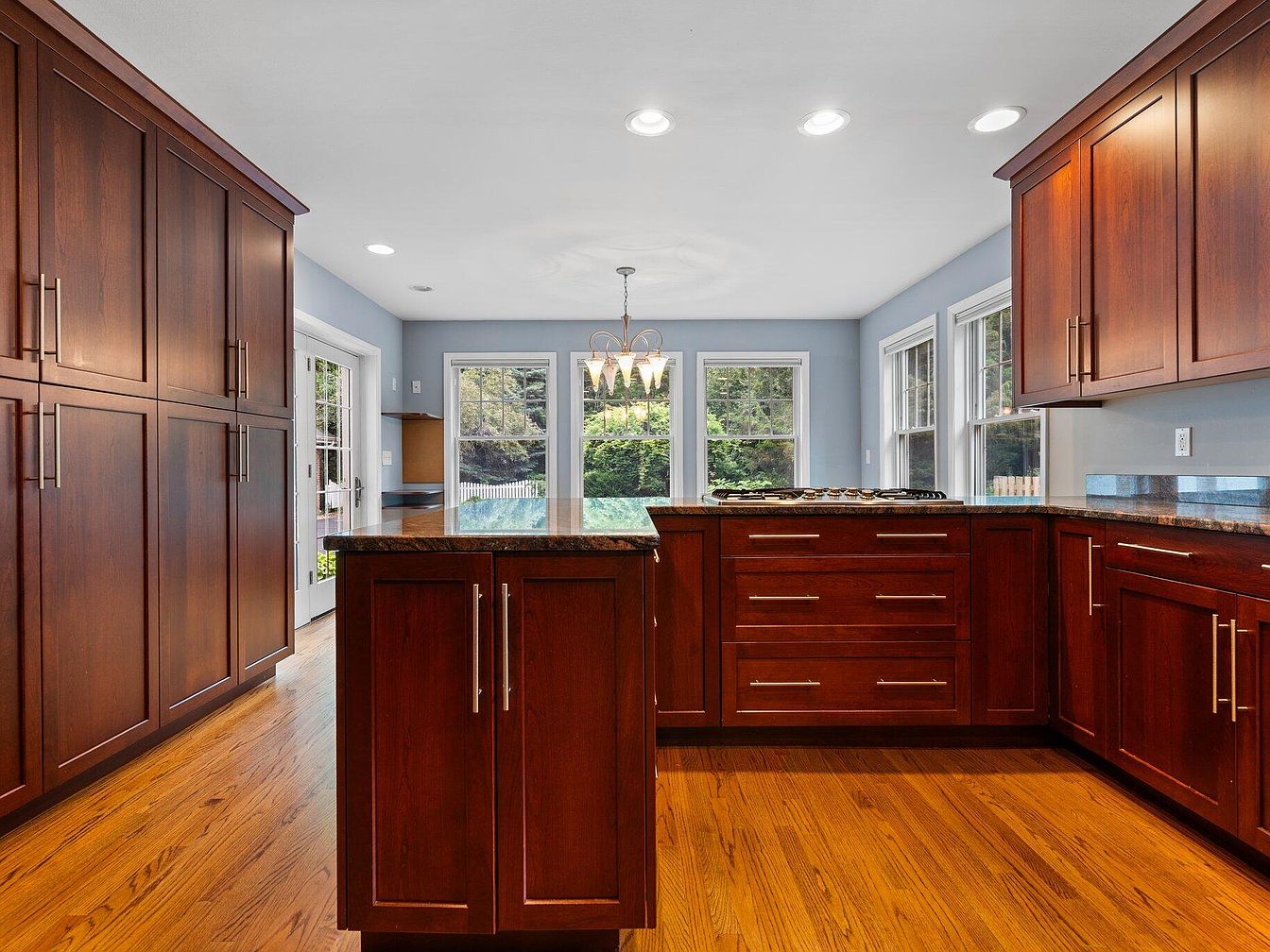 The kitchen features rich, cherry wood cabinetry paired with a dark, polished granite countertop. A large central island provides additional workspace and storage, illuminated by recessed lighting along the ceiling. The wall color is a soft blue, enhancing the overall warmth of the wood tones and contrasting beautifully with the stunning dark countertop. Natural light floods the space through multiple windows, showcasing a view of the lush greenery outside. Stainless steel appliances add a modern touch, integrating seamlessly with the overall classic aesthetic. The combination of materials creates an inviting and functional cooking environment.
