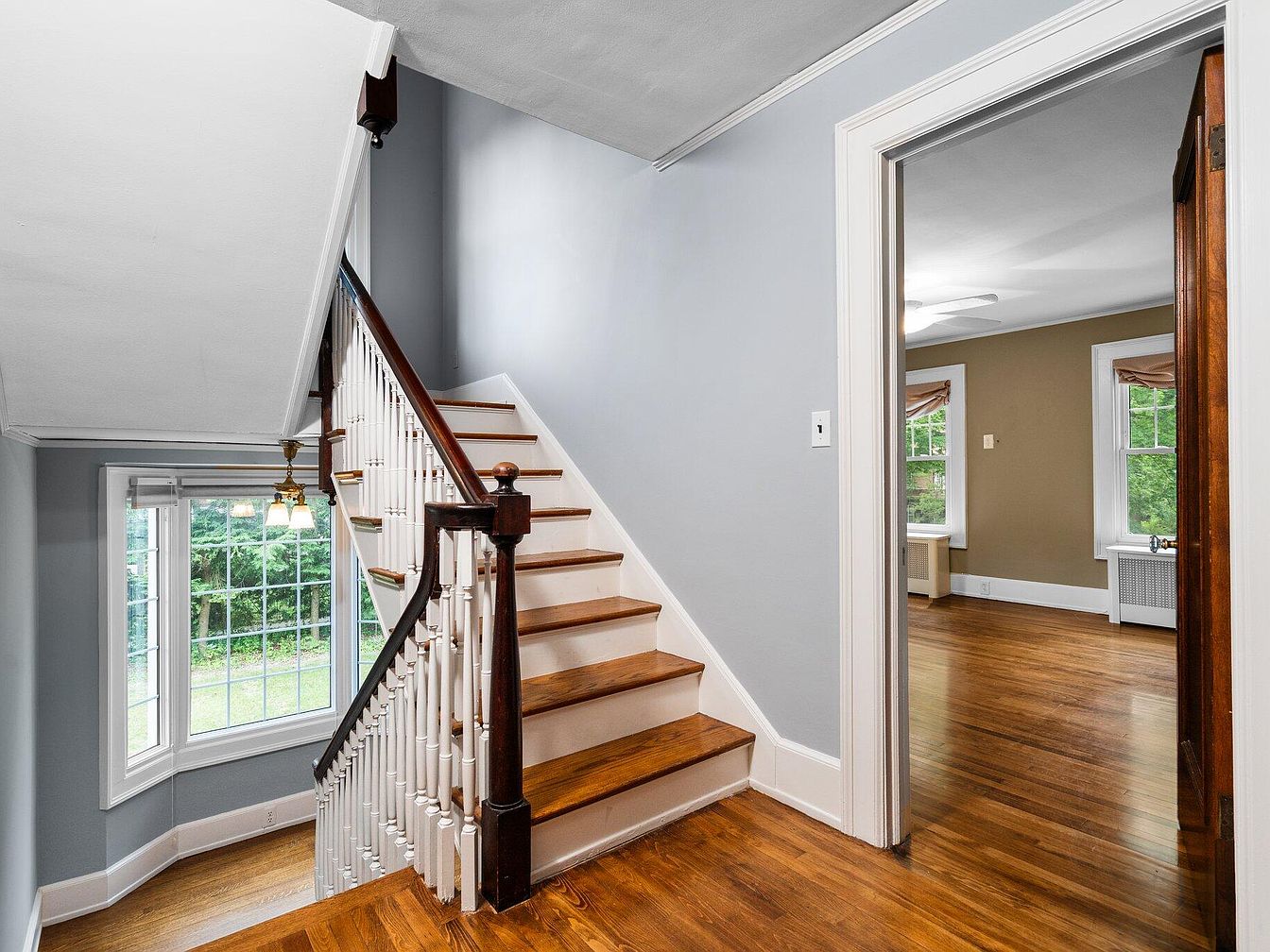 A well-lit entryway featuring elegant wooden stairs leading to an upper level. The staircase boasts a dark wood handrail contrasted against crisp white spindles, creating a classic appeal. Walls are painted a soft gray that complements the rich walnut flooring. To the left, a large bay window allows natural light to pour in, illuminating the space. The window features a simple white trim, enhancing its charm. A doorway to the right leads into a spacious room with warm, earthy tones. Architectural details include crown molding along the ceiling, adding to the historic character of the home.