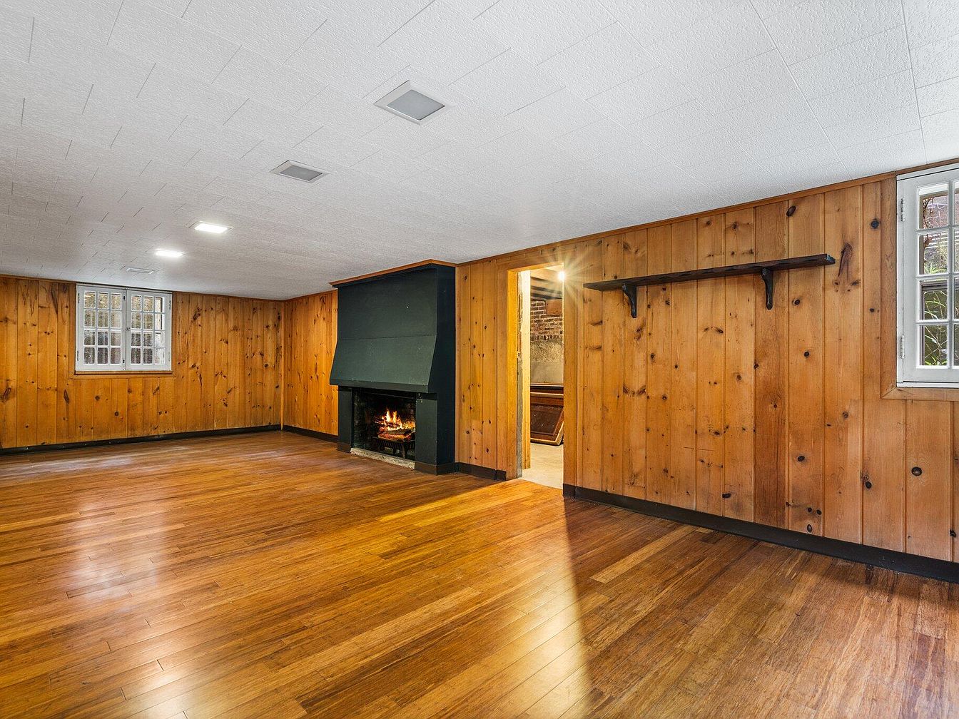 This basement lounge features warm wooden paneling that creates a cozy atmosphere. The rich, honey-toned wood contrasts beautifully with the sleek, polished hardwood flooring, which enhances the space’s warmth and depth. A minimalist black fireplace serves as a focal point, adding character and functionality. Natural light streams through the small, multi-paned window, illuminating the room without overpowering the subdued tones. A simple black shelf runs across one wall, providing an option for decorative elements or storage. The ceiling offers a contemporary texture with recessed lighting, balancing the rustic charm of the wood with modern design.