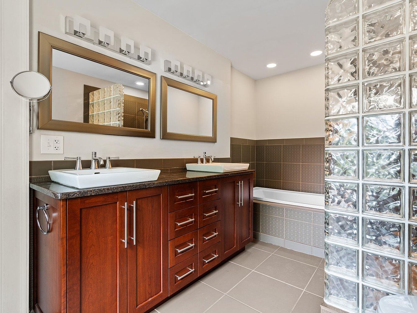 The bathroom features a modern layout with a dual-sink vanity set against a warm wood cabinetry in rich brown tones. Each sink has a sleek white rectangular basin that contrasts elegantly with the dark granite countertop. Above the sinks, two large mirrors framed in gold enhance the space, while stylish light fixtures provide ample illumination. The walls are adorned with a soft beige paint that complements the darker tile accents along the lower half, creating a harmonious color palette. A glass block partition offers both privacy and natural light to the shower area, accompanied by a comfortable soaking tub.