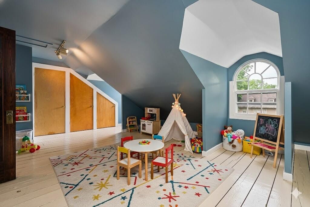 This playroom features a bright blue color scheme, enhancing the cheerful atmosphere. A low white table sits centrally, surrounded by four colorful chairs, inviting playtime. The hardwood floors are painted white, contrasting beautifully with the vibrant rug adorned with playful patterns in various hues. To one side, a small teepee adds a whimsical touch, serving as a cozy nook for children. Storage baskets and plush toys are scattered around, promoting an organized yet playful environment. Two adjoining angled walls showcase wooden doors, leading to hidden storage, while a stylish arched window offers natural light, making the space feel inviting.