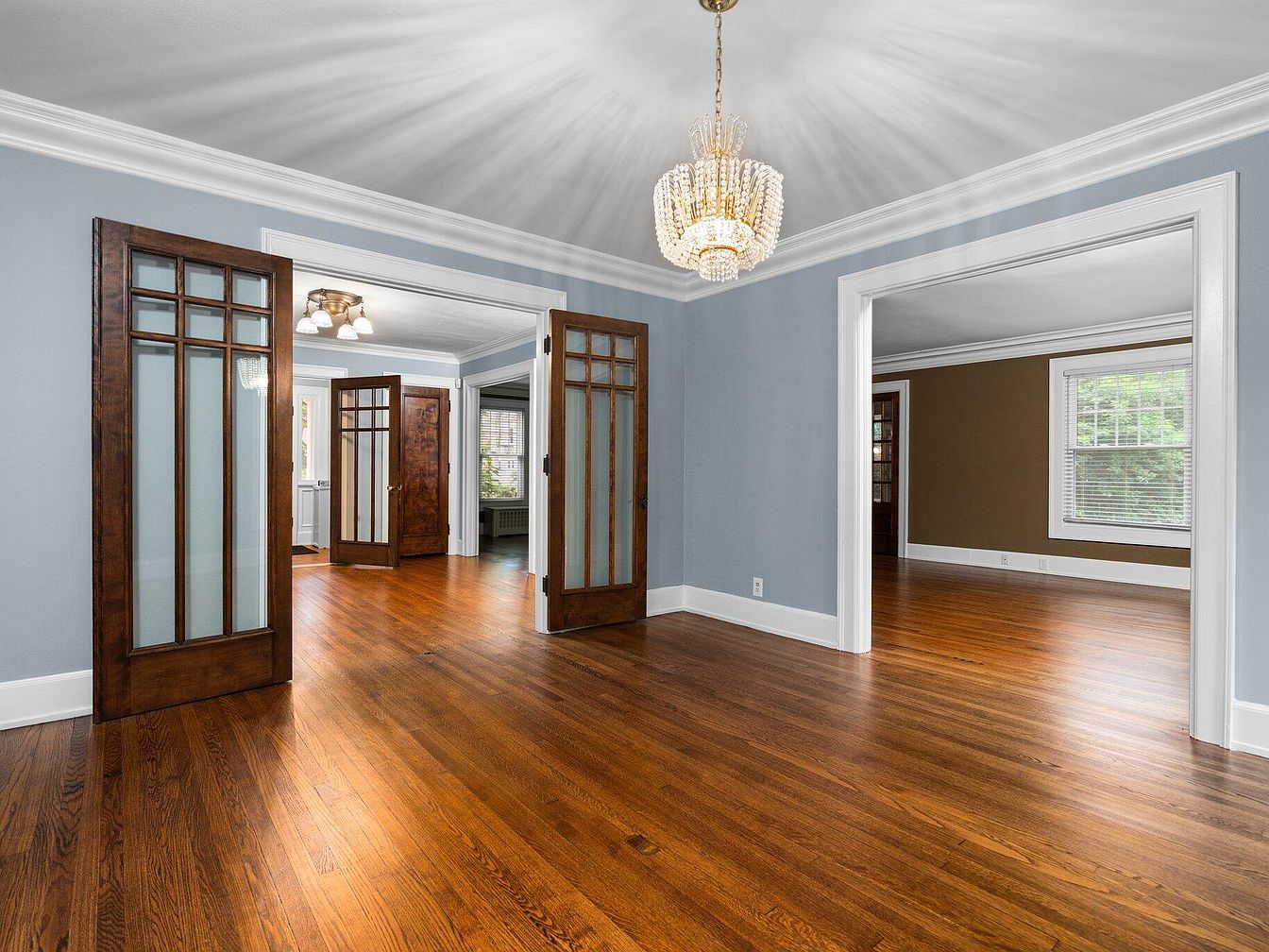 A spacious living room showcases a blend of elegance with modern comfort. The walls are painted in a soft light blue, adding a calming ambiance enhanced by natural light streaming through large windows. Rich, polished hardwood flooring adds warmth, while the prominent chandelier casts an inviting glow. Double doors with glass panels divide the room, showcasing intricate woodwork and inviting seamless transitions between spaces. Architectural details include a classic crown molding that adds sophistication. The room’s layout promotes fluid movement, with an additional corner featuring a contrasting deep brown wall, creating visual interest and depth.