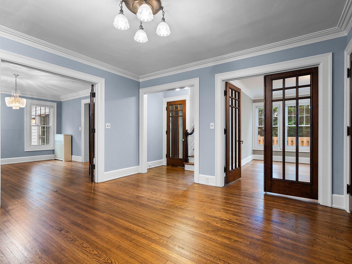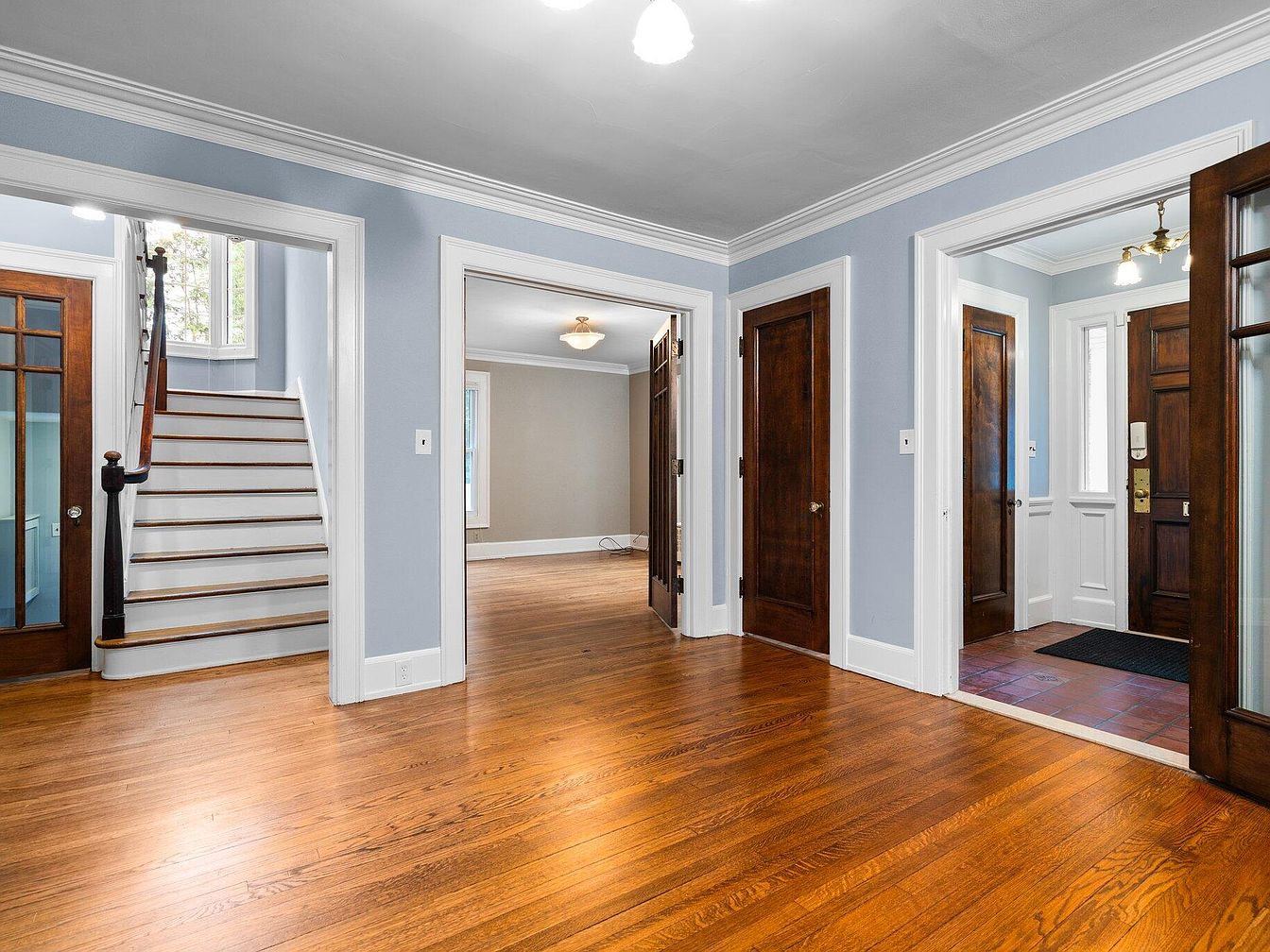 The entry hall showcases a spacious and inviting layout, with rich, polished hardwood flooring that adds warmth. Soft blue walls contrast beautifully with crisp white crown molding and door frames, enhancing the classic aesthetic. A multi-bulb ceiling fixture illuminates the space, complemented by a chandelier visible through the adjacent room. Doorways with glass-paneled accents lead to various areas, providing an airy feel. Natural light streams in from generous windows, highlighting the elegant architectural details. The overall ambiance is a harmonious blend of traditional charm and modern decor, creating a comfortable yet stylish entryway.