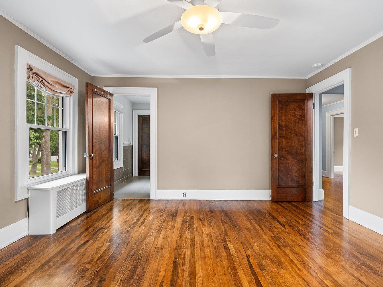 This room features warm beige walls that create a cozy ambiance, complemented by rich, polished hardwood floors that add character and depth. A ceiling fan circulates air, enhancing comfort. Two classic wooden doors, in a deep mahogany finish, frame the entrances, contrasting beautifully with the lighter walls. Natural light floods in through large, multi-pane windows adorned with soft drapery, highlighting the room’s spaciousness. A sleek white radiator sits beneath a window, maintaining traditional aesthetics while ensuring warmth. Overall, the layout is functional and inviting, showcasing a blend of modern convenience and historic charm.