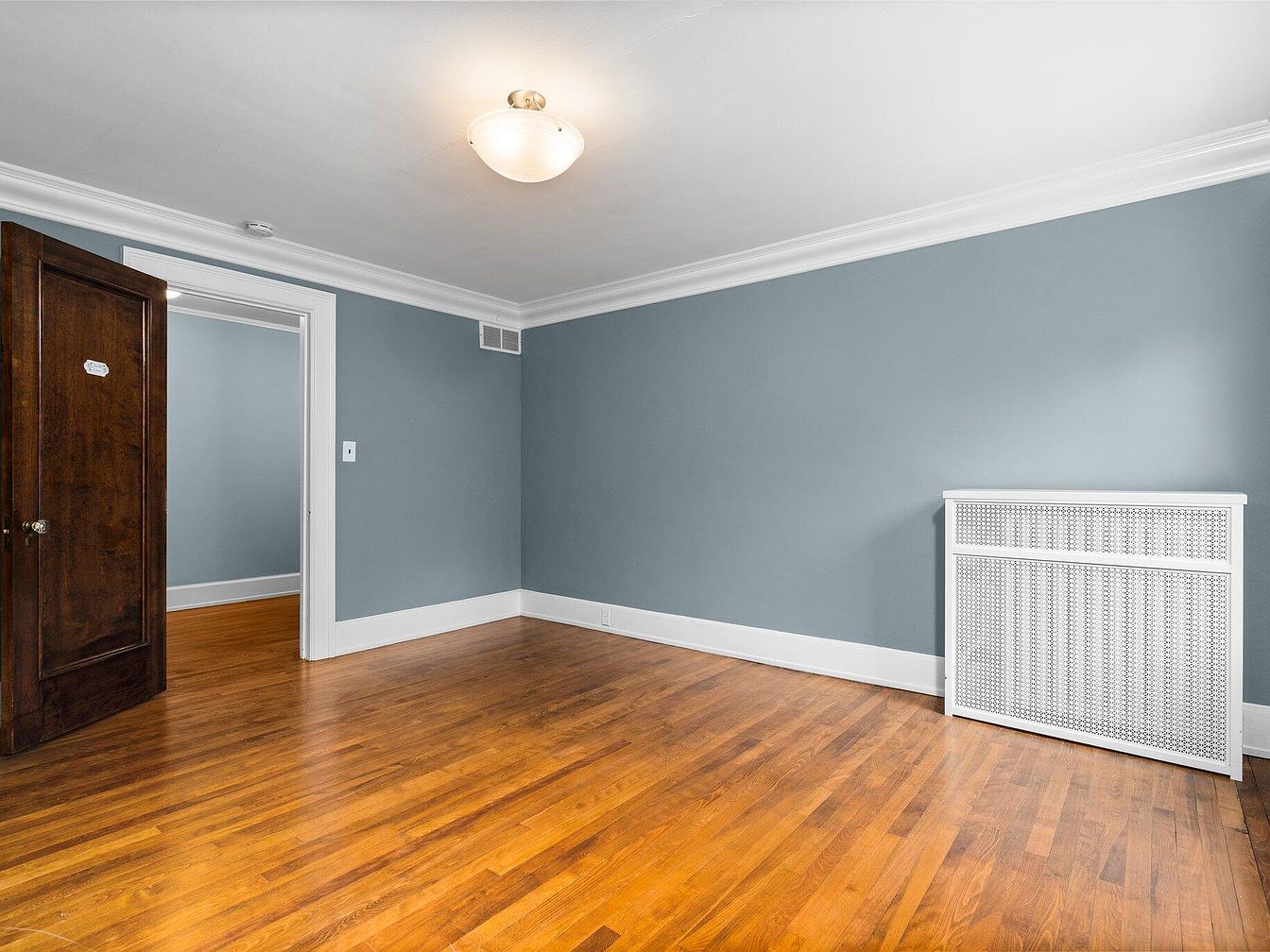 The room features a serene blue-gray color on the walls, creating a calming atmosphere. Rich wooden flooring adds warmth, contrasting beautifully with the lighter tones. A classic ceiling fixture casts soft light, enhancing the cozy feel. Architectural details include elegant crown molding along the ceiling, hinting at traditional charm. A tall, dark wooden door, leading to another space, is positioned against one wall, while a white, louvered radiator cover balances the color palette. The simplicity of the design allows for versatility, making the space readily adaptable to various decorative styles.