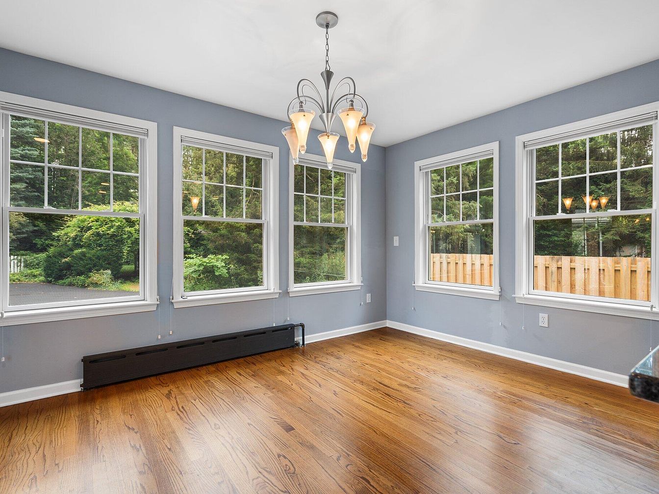 This sunroom features a serene atmosphere, highlighted by soft blue walls that complement the natural light streaming through four large windows. Each window frames lush greenery outside, creating a tranquil view. The hardwood floor, with its rich, warm tones, contrasts beautifully with the cool wall color, enhancing the cozy feel of the space. A stylish light fixture with elegant, cream-colored glass shades hangs from the ceiling, providing ample illumination. The layout is open and inviting, perfect for relaxation or casual gatherings, and the sleek black heating unit along the base of the wall adds a modern touch to the room.